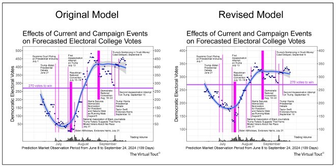 The figure below shows forecasts for September 24, 2024 from the original and revised models. The result is a “rescaling” of the electoral votes axis. Relative electoral vote forecasts (trends across current and campaign events) are consistent between the original and revised models.